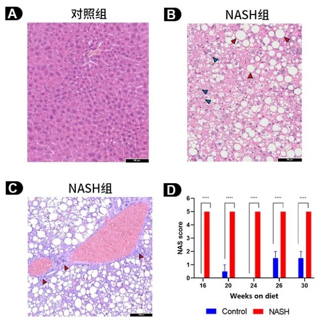 飼養26周后小鼠的肝組織病理切片:(A)正常對照組小鼠肝小葉結構清晰、完整,肝細胞以中央靜脈為中心,呈放射狀排列,無肝細胞氣球樣變或炎癥細胞浸潤;(B)NASH組小鼠的肝組織小葉結構紊亂,大泡性脂滴占了總細胞的2/3以上,出現嚴重的脂肪變性, 局部以浸潤為主的局灶壞死性炎癥;紅色箭頭:脂肪變性;藍色箭頭:氣球樣變;(C)NASH組小鼠的肝纖維化可以達到F2級標準(moderate中度纖維化);紅色箭頭:纖維化 ;(D)NAS評分。數據以Mean±SEM呈現。使用Two-way ANOVA進行統計學分析。ns: not significant, *: p<0.05, **: p<0.01, ***: p<0.001, ****: p<0.0001。Scale bar = 100 µm。