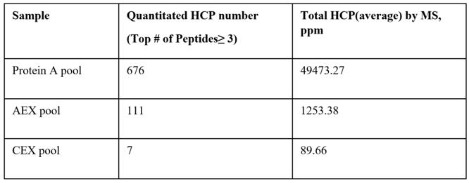 在經(jīng)過一步ProteinA純化后的樣品中,鑒定到676個具有定量信息的HCP(peptide≥3,下同);再經(jīng)過一步陰離子交換色譜(AEX)純化后,HCP數(shù)目下降至111;在此基礎(chǔ)上再進(jìn)行一步陽離子交換色譜(CEX)純化后,僅檢測到7個HCP。三個樣品中定性及定量的HCP數(shù)目請見表1。