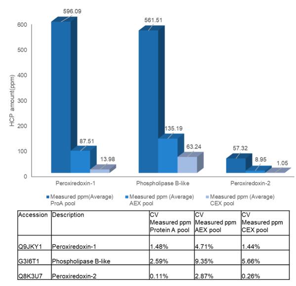 對于會引起免疫響應(yīng)、降解蛋白或輔料的高風(fēng)險(xiǎn)HCP是科學(xué)家們在產(chǎn)品工藝的優(yōu)化過程中尤為注意的。圖2展示了隨著純化步驟的增多,高風(fēng)險(xiǎn)HCP數(shù)目呈減少趨勢。圖3展示了經(jīng)過三步純化后依然能夠鑒定到的三個高風(fēng)險(xiǎn)HCP及其各自的含量。