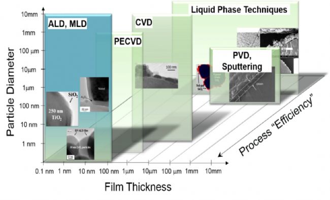 各類包覆技術對于涂層厚度控制以及適用的顆粒粒徑范圍