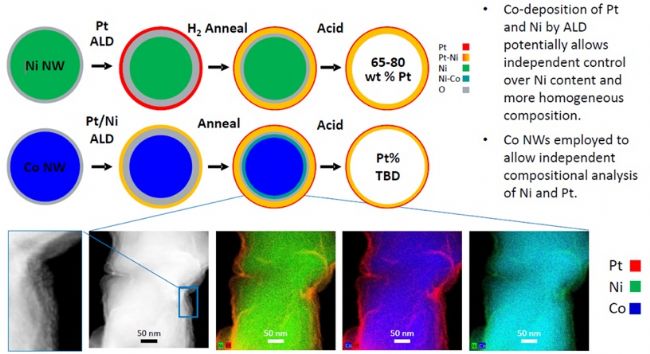 在另一項同樣來自美國國家可再生能源實驗室的研究中,使用高通量的 ALD 技術構筑 Pt 催化劑涂層,可實現 Ni / Co 納米線材料的高效催化,并防止金屬元素浸出損耗 [2]。