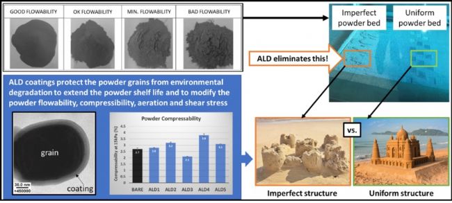 粉末冶金利用粉末材料鑄造型材,這對粉末材料的流動性和分散性有較高的要求。在粉末熔融的過程中,團聚顆粒以及天然氧化層中的雜質對于最終型材的質量會有較大影響。通過 ALD 技術進行粉末包覆后,材料的抗侵蝕,耐潮性,流動性有明顯改善,同時涂層成分的變化還可以賦予粉末功能,如改變其反射率,親水性等,擴大應用場景 [3]。
