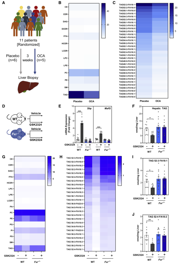 為研究FXR激活如何改變肝臟TAG水平,將11名等待膽結石手術的患者隨機分組,并用安慰劑(n = 6)或FXR激動劑OCA(n = 5)治療3周,收集肝臟活檢組織。FXR靶基因BSEP誘導和膽汁酸合成酶CYP7A1降低證實 OCA組患者肝臟FXR激活。對肝臟組織進行脂質組分析,顯示FXR激活特異性地降低了肝臟中TAG,但不影響其他脂類。TAG種類具體分析表明,OCA處理造成大部分TAG種類水平降低,主要是含有一個雙鍵脂肪酸的TAG(MUFA),以及含有不同程度的兩個或多個雙鍵 (PUFA)的TAG。