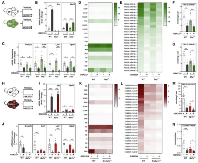 有研究表明,FXR通過SREBP1c(許多脂肪生成基因的主要轉錄激活因子)的SHP依賴性降低來調節肝臟TAG。為確定TAG的FXR依賴性減少是否由轉錄抑制因子SHP介導,用GSK2324處理野生型和Shp-/-小鼠3天。結果顯示野生型和Shp-/- 小鼠FXR激活誘導了FXR靶基因MafG的表達,而僅在野生型小鼠中誘導了Shp表達。此外,GSK2324抑制野生型和Shp-/-小鼠肝臟中Srebp1c、Scd1、Lipin1和Dgat2基因表達,表明這些基因的抑制與SHP無關。同時GSK2324降低了肝臟 TAG水平(包括MUFA和PUFA的TAG),以上數據顯示肝臟TAG的FXR依賴性調節在很大程度上獨立于SHP。