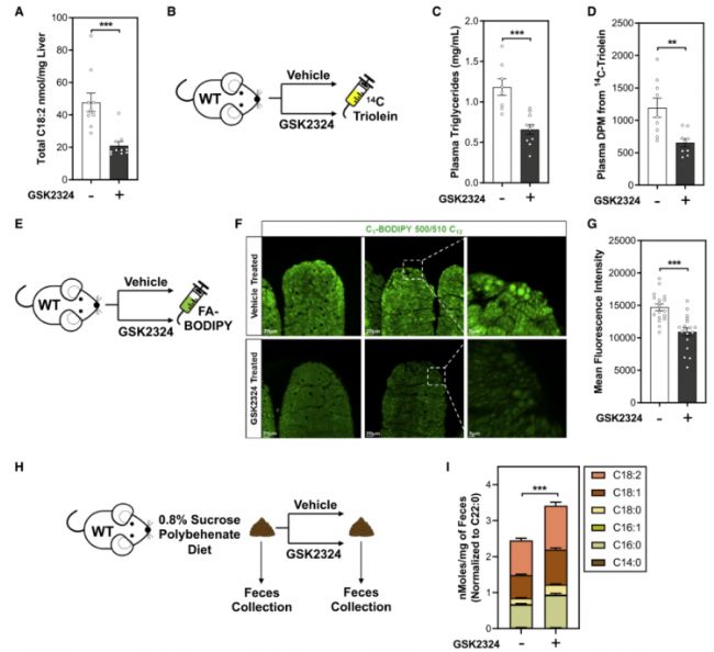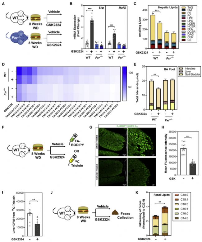 FXR激活導致WD飲食小鼠肝臟TAG顯著降低,表明脂質吸收的變化可能已發生變化。因此, WD 飲食野生型小鼠進行三種方法測定脂質吸收。結果表明,GSK2324處理顯著增加了糞便脂肪酸含量,與腸道脂質吸收減少一致。