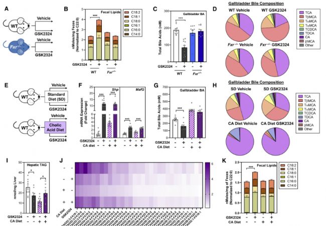 隨后采用標準飲食或0.5% CA補充飲食喂養野生型小鼠4天,喂養期最后三天用對照或GSK2324處理各組小鼠。CA飲食可增加肝臟FXR靶基因表達,而GSK2324依然可以誘導FXR靶基因Shp和MafG表達。并且GSK2324顯著降低標準飲食小鼠總膽汁酸(特別CA降低),但CA飲食小鼠沒有變化。表明0.5% CA足以恢復標準飲食小鼠膽汁酸池大小。肝臟TAG脂質組學分析表明,標準飲食小鼠FXR激活降低總TAG和多種TAG種類,而補充CA后肝臟TAG出現增加。標準飲食和CA飲食小鼠經GSK2324處理后關鍵脂肪生成基因 Srebp1c、Scd1、Lpin1和Dgat2表達顯著降低。重要的是,CA可以消除GSK2324處理后糞便脂肪酸的增加。這些數據表明FXR激活會降低腸道脂質吸收,而補充膽汁酸可以挽救這種減少,說明FXR依賴性的脂質吸收減少由膽汁酸池組成變化介導。