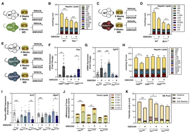 為確定肝臟或腸道 FXR是否介導肝臟脂質和吸收的變化。本研究構建肝細胞FXR缺失小鼠(FxrLiv-KO)或腸細胞FXR缺失小鼠(FxrInt-KO)。隨后WD飲食 8周,同樣用GSK2324處理3天。相比FxrLiv-KO小鼠,肝臟FXR靶基因Shp在Fxrfl/fl和 FxrInt-KO小鼠中均被誘導表達。相反,腸道FXR靶基因Fgf15在 Fxrfl/fl和 FxrLiv-KO小鼠回腸中被誘導表達,但FxrInt-KO小鼠沒有變化,證實了每個模型的組織特異性敲除。脂質組學分析結果顯示FXR激活顯著降低Fxrfl/fl小鼠肝臟TAG;然而,FxrLiv-KO和FxrInt-KO小鼠TAG水平都沒有顯著降低,表明肝臟和腸FXR都參與了肝臟TAG的調控。GSK2324干預后,Fxrfl/fl和FxrInt-KO小鼠肝臟脂肪生成基因Scd1、Dgat2表達降低,而在FxrLiv-KO小鼠中沒有變化。糞便脂質組學分析顯示FXR激活顯著增加Fxrfl/fl和FxrLiv-KO小鼠糞便脂質,而FxrInt-KO小鼠中沒有變化。這些數據表明腸道脂質吸收的變化很大程度上取決于腸道 FXR激活。隨后對膽汁酸池進行定量分析,結果顯示GSK2324顯著降低Fxrfl/fl和FxrLiv-KO小鼠膽汁酸池,而在FxrInt-KO小鼠中變化不明顯。這些數據表明,GSK2324介導的肝臟TAG減少需要肝臟和腸道FXR,但通過兩種不同的途徑發揮作用。肝臟FXR控制從頭脂肪生成的選擇性變化,而腸道FXR減少腸道脂質吸收。
