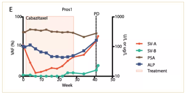 E、患者Pros1兩種SV的VAF、治療、實驗室指標(前列腺特異性膜抗原(PSA)、堿性磷酸酶(ALP))和臨床疾病進展(PD)。