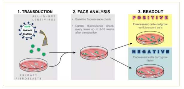 LATE檢測的原理包括 (1)用編碼熒光蛋白、設(shè)計的核酸酶(Cas9)和gRNA的慢病毒載體轉(zhuǎn)導(dǎo)原代人類新生兒包皮成纖維細胞 (NUFF),(2) 使用流式細胞術(shù)分析轉(zhuǎn)導(dǎo)率并連續(xù)監(jiān)控長達10周,(3)讀取結(jié)果,隨著轉(zhuǎn)導(dǎo)細胞數(shù)量的增加,作為基因組編輯效應(yīng)的細胞獲得生長優(yōu)勢