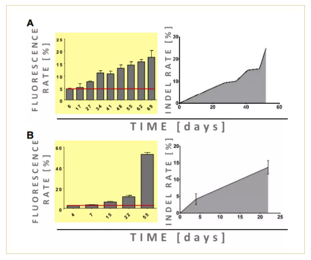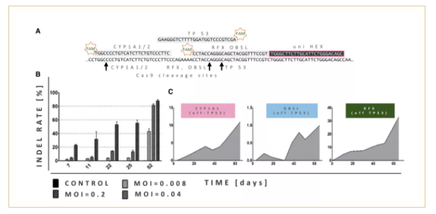 隨后進行Stilla naica®微滴芯片數(shù)字PCR系統(tǒng)檢測,結(jié)果顯示隨著時間的推移,TP53插入缺失的頻率隨之增加,轉(zhuǎn)導(dǎo)后第7天插入缺失率為1%–22%,在52天后達到44%–85%的峰值,該變化趨勢和細胞獲得生長優(yōu)勢的趨勢一致。(圖2B)