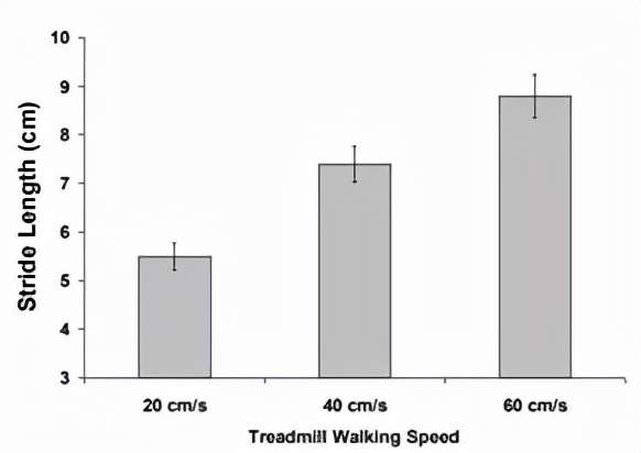 實驗結果顯示速度的影響非常明顯。然而,即使是小的速度變化的增量可以顯著影響步態指標。這些知識應該幫助闡明為什么動物可以任意行走的自愿地上模式和許多速度,產生結果與非常高的標準誤差。速度差異在解釋步態差異時,受試者之間是最重要的混雜因素。因此,一只患有亨廷頓舞蹈病的垂死的老鼠可能是較短的步幅也就正常了。通過跑步機,你可以通過適當的速度選擇,減少標準誤差,增加你的模型重復性。
