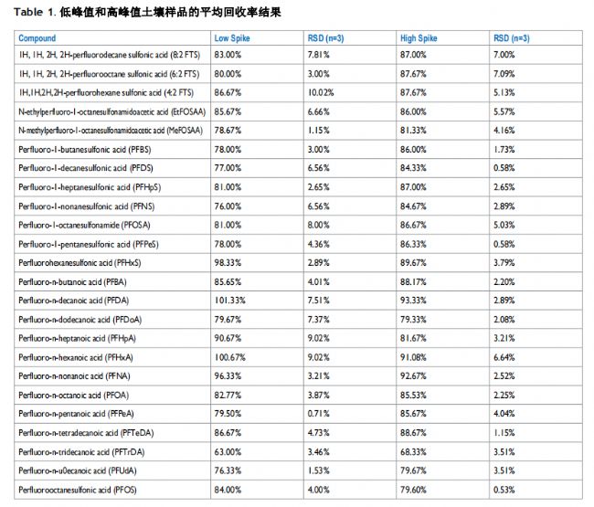 下表中低加標和高加標的回收率數據表明,樣品提取效率高,回收率范圍為 63% 到 101%。所得 RSD 值也很低,表明回收率數據可重現。空 Q- Cup 的萃取數據表明,系統內沒有任何加標化合物的殘留,表明清洗的強度足以去除任何殘留的 PFAS 化合物。