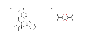 圖 1:a) Tadalafil的結構,b) 對苯二甲酸二甲酯 (DMT) 的結構。 綠色和紅色圓圈代表本研究中評估的質子。