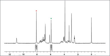 圖 2. Tadalafil和 DMT 在 DMSO-d6 中的混合物的 1H NMR 譜,使用Nanalysis 臺式 60PRO 采集。 綠色和紅色圓圈分別代表Tadalafil和 DMT 評估下的質子。