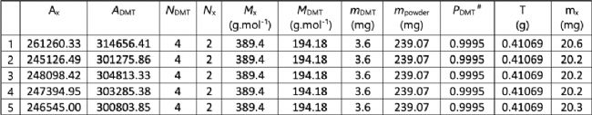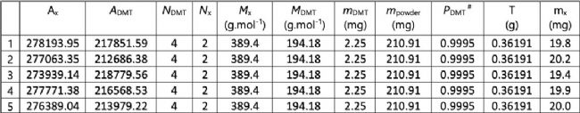 表 1:使用對苯二甲酸二甲酯 (DMT) 作為內部校準物測定Tadalafil (X) 參考化合物的純度。
