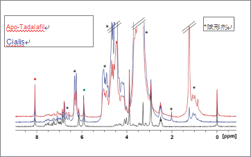 圖 3. Tadalafil參考標準在 DMSO-d6 中的 1H NMR 譜(黑色); 用 DMT 在 DMSO-d6 中提取 Cialis 片劑的 1H NMR 譜圖(藍色); 用 DMT 在DMSO-d6 中提取po-Tadalafil片劑的 1H NMR 譜(紅色)。 所有光譜均在 Nanalysis 60PRO 中采集。