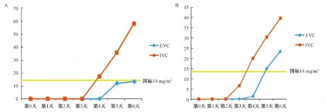氨濃度:分別進行兩次連續6d籠盒內氨氣濃度檢測。EVC和IVC分別放置10籠小鼠,每籠5只,且房間檢測面積均為12.75m2。兩次檢測的前4d,EVC飼養籠盒內的氨氣濃度都處于較低水平,但在第5天開始出現較高氨氣濃度,接近國標14mg/ m3;IVC在飼養到第三天時,籠盒內能聞到明顯氨氣,說明濃度已經很高,第4天就超過了國標要求的最低標準 [13-14] 。IVC 在換氣次數高的前提下,籠盒內的氨濃度反而比EVC高,說明籠盒內空氣流動不均勻,換氣不完全。因此,與IVC系統比較,EVC系統的房間內氨濃度會更低。
