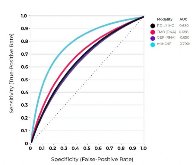 空間表型的核心是一種被稱為多重免疫熒光(mIF)的技術,這是新一代病理工作流程,可生成有關癌癥樣本的定量和可重復的見解。Lu等人發表在《JAMA Oncology》上的一項多種診斷技術的meta分析顯示,在預測誰將對PD-1/PD-L1免疫治療產生反應方面,mIF比目前廣泛使用的技術PD-L1 IHC、基于下一代測序的腫瘤突變負荷(TMB)和基因表達譜(GEP)具有更高的預測價值。