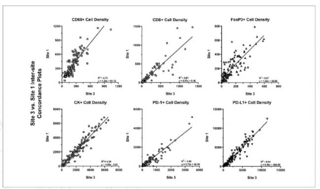 在堪稱里程碑的多機構TSA擴增多重免疫熒光重復性評估(MITRE)研究中,6家機構使用了mIF解決方案,以證明和驗證了一個基于腫瘤組織樣本中的PD-1/PD-L1免疫檢查點信號自動化的端到端工作流程。研究結果表明,在測量IC密度、共表達和接近參數方面,實驗室內和實驗室間的一致性很高。MITRE的結果代表著基于mIF方法的自動化空間生物學工作流程標準化的重要一步,該工作流程提供了支持臨床試驗所需要的性能水平,并可在未來應用于臨床試驗。