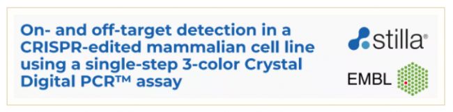 歐洲分子生物學實驗室(EMBL)研究人員Moritz Kueblbeck, Andrea Callegari等分享了一種快速驗證基因編輯效果的實驗方案。該方案使用naica®微滴芯片數字PCR系統(Crystal Digital PCR™)實現了一次三色分析就可完成目標拷貝數的評估和脫靶事件的檢測。且基于數字PCR (dPCR)的高敏感性,無需大量的樣品,因此,在早期就可以完成篩選試驗。Crystal Digital PCR™一次實驗3個小時內就可完成,對于編輯錯誤的克隆當天就可終止培養。那么這個實驗具體是怎么設計的?就讓我們一起來看看吧。