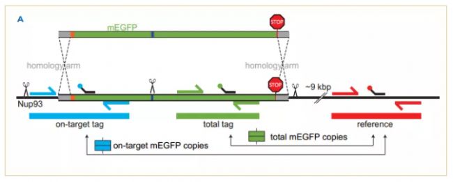 3.reference(CY5基團標記)作為內參,對“total tag”和“on-target tag”進行歸一化。“total tag”歸一化獲得整合的mEGFP拷貝數和“on-target tag”獲得靶標上整合的mEGFP拷貝數。