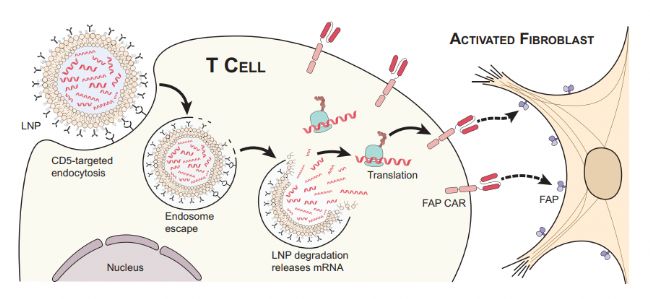CAR-T細胞—嵌合抗原受體(CAR)細胞,是將免疫T細胞在體外進行基因重編程,使其表達能夠識別病變細胞上特定抗原的受體蛋白。此外,也可將T細胞靶向抗體修飾在LNPs表面,在體內產生短暫有效的CAR - T細胞。兩種制備方式有著相同的優異特性,即大大提升了T細胞的靶向性。CAR-T細胞治療對于多種疾病的醫治都有了實質性的突破,如白血病(1)、心臟纖維化(2)。