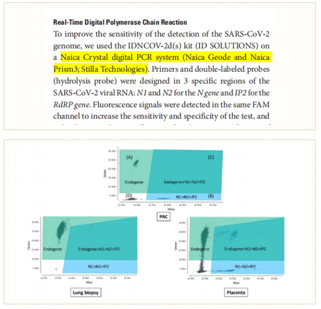 ▲利用RT-dPCR技術(shù),從陽性對照(PAC)、固定肺組織和胎盤檢測SARS-CoV-2病毒載量的2D微滴圖。(A)HEX通道的陽性微滴檢測內(nèi)源性細(xì)胞。(B)FAM通道檢測3個SARS-CoV-2靶點。(C)在FAM通道和HEX通道均可以檢測到內(nèi)源性細(xì)胞和SARS-CoV-2靶點。(D)陰性微滴