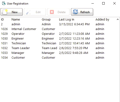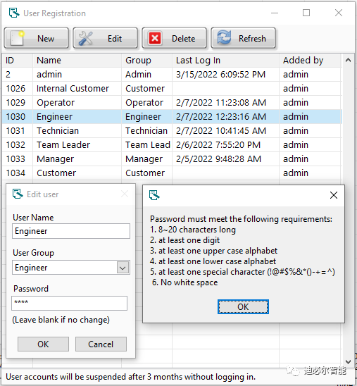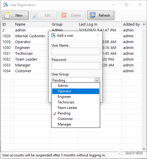 在D2MS中,管理員可以通過將某一用戶分配至Pending這一組而禁止其登錄。將其移至其他可以登錄的組,如Operator,則可重新登錄。管理員還可刪除某用戶。被刪除的用戶將在列表中消失,但其所有操作記錄仍存在于數據庫中。