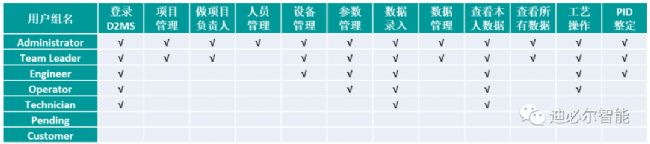 在D2MS中,用戶權限是由用戶所在的組決定的。管理員在新建用戶時,需要指定用戶所在的組。用戶自己注冊時(新用戶名第一次登錄D2MS) 會被臨時放入Pending這一組。這一組不能登錄D2MS需要管理員將其轉移到其他合適的組才能登錄。不同用戶組的具體權限分配見圖3表格。同樣不能登錄D2MS的還有Customer這一組,相關細節我們會在后繼介紹D2MS項目管理功能時詳細介紹。