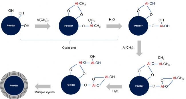 與傳統的表面改性不同,PALD 是真正可以實現原子級/分子層級控制精度的粉末涂層技術,并保持良好的共形性。原子層沉積技術是一種基于自限制性的化學半反應將被沉積物質以單原子膜的形式一層一層的鍍在物體表面的薄膜技術。與常規的化學氣相沉積不同,原子層沉積將完整的化學反應分解成多個半反應,從而實現單原子層級別的薄膜控制精度。由于基底表面存在類似羥基這樣的活性位點,因此前驅體可以形成單層的飽和化學吸附,從而實現自限制性反應。而在經過單個周期反應后,新的位點暴露出來,可以進行下一個周期的反應。而 ALD 反應的特點決定了: