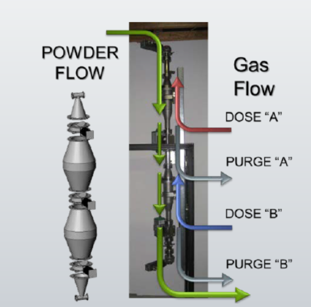 為了有效提升流化床的吞吐量,采用空間 ALD 的方法可有效提升處理效率。常規的 ALD 工藝基本是粉末固定,前驅體不斷通入流出。而空間 ALD 則讓粉末不斷運動,在多級腔室中進行不同的半反應。根據實驗級 ALD 的工藝,通過將多個流化床反應器連接在一起,可以實現設定周期的 ALD 反應,每個腔室進行不同的半反應,而粉末可從第一個腔室不斷轉移到新的腔室完成反應。當腔室體積足夠大,即可實現百公斤級甚至噸級的連續批次粉末處理。
