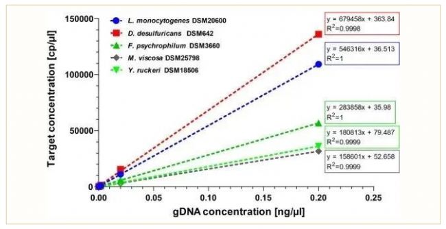 ▲圖1:naica®微滴芯片數字PCR系統定量5種細菌的線性回歸圖,分別給出相應的方程和回歸系數。