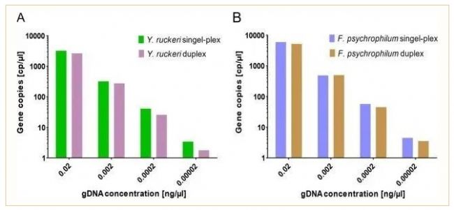 ▲圖2:對魯氏耶爾森菌Yersinia ruckeri(A)黃桿菌Flavobacterium psychrophilum(B)的單、雙重分析結果進行比較。在MMC-DNA背景(1 ng/μl)中添加魯氏耶爾森菌Yersinia ruckeri ,黃桿菌Flavobacterium psychrophilum gDNA,10倍稀釋后進行基因拷貝數定量。