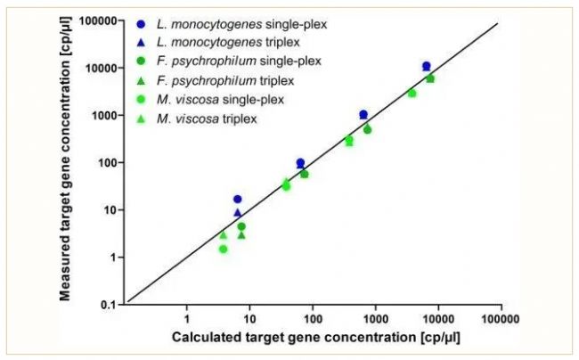 ▲圖3:在1 ng/μl MMC-DNA背景下,單重(圓形)和三重(三角形)測定的靶基因拷貝濃度繪制。恒等線表示每個點的X坐標和y坐標相等的位置。