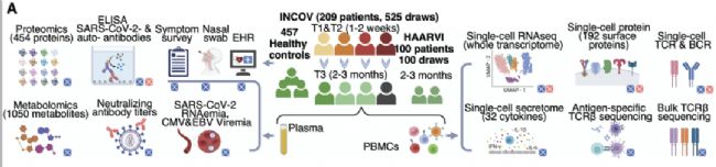 據估計,約31%-69%的COVID-19患者患有PASC,其癥狀包括記憶喪失、胃腸道(GI)不適和疲勞、嗅覺喪失和呼吸短促。之前的研究表明,PASC也與患者急性疾病的嚴重程度有關,PASC可能與自身免疫因素有關。由于PASC的異質性和可能與之相關的各種因素的差異,迫切需要描述其生物學和免疫學基礎,以及檢測這些機制在整個感染和恢復過程中的變化。
