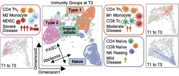 免疫失調可能與PASC有關;而且許多與嚴重急性COVID-19相關的免疫細胞表型仍在T3時不同程度上富集,并與PASC相關。根據病人的免疫學特征可以將病人分為四組,即Type1組,Type2組,intermediate組和naïve組(圖2)。