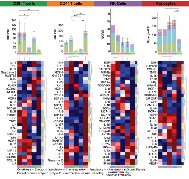 圖3:不同組病人特定細胞亞群的多功能性和細胞因子差異