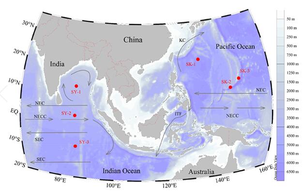 圖1西太平洋與東印度洋采樣點。NEC、NECC、SEC、KC、ITF代表北赤道海流、北赤道逆流、南赤道流、黑潮和印尼通流(引自,Daoji Li et al.2020)