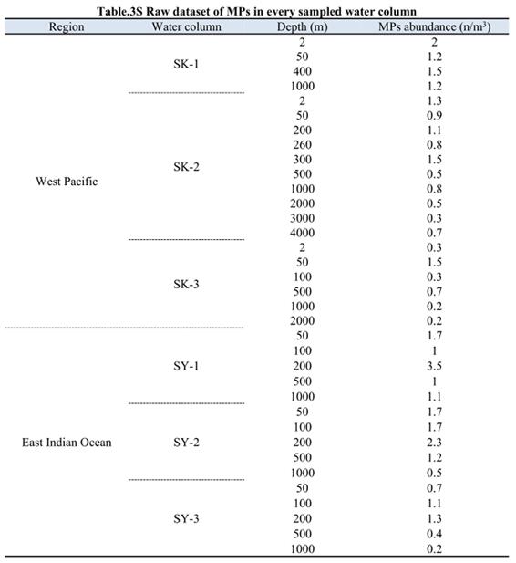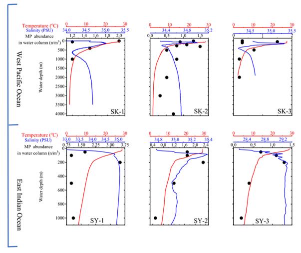 圖3  PO 站位(SK-1、SK-2、SK-3)和IO站位 (SY-1、SY-2、SY-3)水體中MPs的垂直分布。(引自,Daoji Li et al.2020)