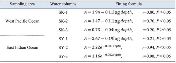 通過進一步分析其發現,在PO和IO站位微塑料具有相同的分布趨勢。另外在這兩個區域中微塑料的豐度沒有明顯差異,但在PO站位中,這種垂直分布模式在不同采樣點有很大的不同。通常認為,微塑料的豐度隨著深度的增加呈指數級下降,但是只在SK-2、SY-2和SY-3發現了這種趨勢(見圖5),同時發現,水溫和微塑料豐度之間存在弱對數關系。
