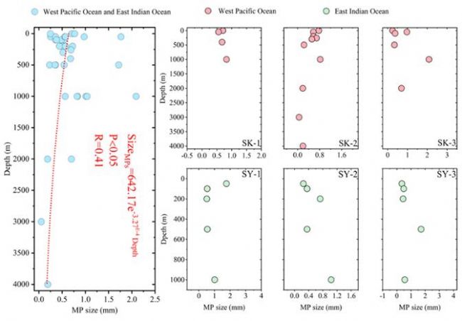 在粒徑方面,PO站位中微塑料顆粒的粒徑范圍為30.12 - 4559.73μm,平均粒徑為668.36μm。在IO站位,粒徑的范圍為38 - 6330μm,平均大小為645.14μm。總體而言,微塑料的大小隨著采樣深度的增加而顯著減小,通常在表層水中檢測到較大的微塑料顆粒(見圖5)。