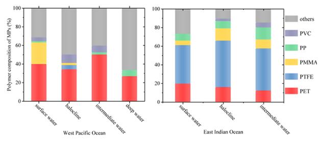 此次研究中共發現了25種不同的聚合物。盡管PP的密度低于海水的密度,但在所有的取樣水層中仍能識別出這些顆粒。密度較大的粒子(PET、PMMA、PTFE和PVC)也觀察到類似的趨勢,因此微塑料垂直分布似乎與聚合物密度沒有什么聯系。在PO區域的所有深度都發現了大量PET塑料,在IO區域也發現了類似的趨勢。