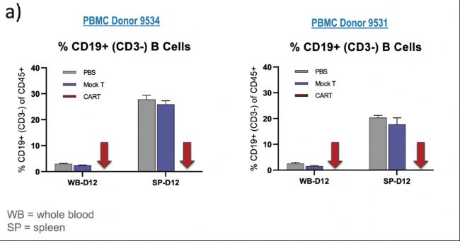 (圖4:不同供體表現出不同的活性/毒性比率。當比較圖4a中兩個單獨的供體時,在兩項研究中,模擬CAR T療法對血液或脾臟中的B細胞比率均沒有影響。代表CAR T的箭頭指向100%去除PBMC衍生的正常CD19+ B細胞,表明對兩個供體的療效和反應是完成的。)