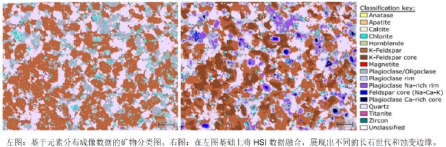 LIBS等元素分布成像技術能夠為礦物分類提供極有價值的基礎化學數據,但是對某些礦物來說并不充分。例如若檢測到了Fe元素,并不能判斷它是赤鐵礦、菱鐵礦、磁鐵礦、還是針鐵礦,而此時HSI技術則是完美的解決方案。本案例采用SisuROCK高光譜成像分析平臺,配備有VNIR(400-1000nm)、SWIR(970-2500nm)及LWIR長波紅外高光譜成像。