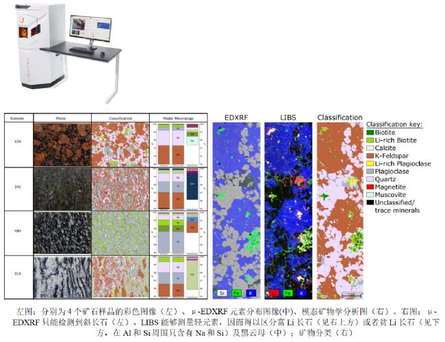 元素分布成像分析能夠為巖相學和模態礦物學提供重要的基礎數據。本案例為了獲取高分辨率的元素分布圖像,應用μ-EDXRF技術(30-50μm)進行檢測,因為所使用的LIBS品牌的空間分辨率僅達200μm。但是μ-EDXRF的缺憾在于不能檢測輕元素,而輕元素的定性定量分析往往是必須的,例如Li元素經常存在于黑云母、白云母、富Na-斜長石、殘余巖漿等礦石中。因此需要訴諸能夠檢測元素周期表中所有元素的LIBS技術。