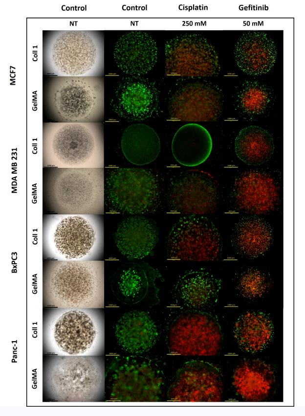 腫瘤轉移和化療耐藥性威脅著腫瘤患者的生存。在癌癥治療領域,化療是一種很有效的治療方式,它利用小的抗癌分子攻擊特定的生長途徑并殺死癌細胞。在這些分子中,順鉑(CIS)和吉非替尼(GEF)是FDA批準的靶向DNA和EGFR通路的抗癌藥物。簡而言之,CIS通過抑制細胞分裂和 mRNA的產生導致細胞凋亡,而GEF干擾癌細胞中EGFR信號的上調。有趣的是,雖然CIS和GEF都被用于治療致命的胰腺癌和乳腺癌,但它們也與體外假陰性或假陽性預測有關,這表明它們在2D和3D中對細胞的影響不同(Reynolds, 2017)。為了進一步解決這一差異,我們使用兩種乳腺癌(MCF7, MDA MB 231)和兩種胰腺癌(BxPC3, Panc-1)細胞系,比較了CIS和GEF對2D單層細胞和3D生物打印類腫瘤模型的作用。