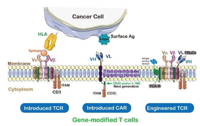對TIL的TCR工程化是腫瘤的最佳治療方法之一。TCR由結合到肽-MHC配體的α鏈和β鏈、CD3復合體的信號亞單位(ϵ、γ和δ)以及CD3ζ同源二聚體組成。除CD3ζ外,所有亞單位均具有細胞外免疫球蛋白(Ig)結構域。基于這些結構,利用工程化TCR的新技術有ImmTAC、TRuCs和TAC等。