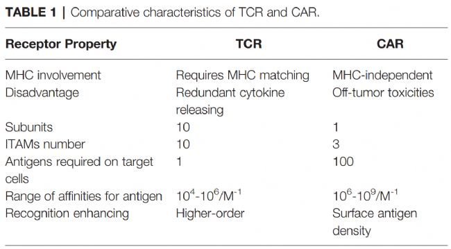 相反,TCR是與MHC抗原復合物結合的α/β異二聚體。與TCR相比,CARs識別腫瘤抗原具有某些缺點,如腫瘤外毒性。與CARs相比,TCRs在基于T細胞的治療中具有一些結構性優勢,例如其受體結構中有更多的亞單位(10:1),免疫受體基于酪氨酸的激活基序(ITAMs)更多(10:3),對抗原的依賴性更小(1:100),以及更多的共刺激受體(CD3,CD4,CD28等等)。具有低MHC親和力范圍(104-106M-1)的TCR就可以有效的激活T細胞,相反,CARs需要更高的親和力范圍(106-109M-1)。
