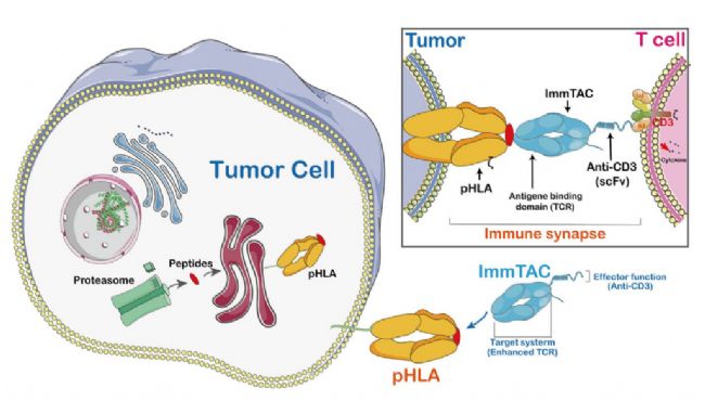ImmTACs是使用工程化、可溶性和親和增強的單克隆TCRs(mTCRs)設計的。ImmTACs基本上是融合蛋白,結合了工程化的TCR靶向系統和單鏈抗體片段(scFv)效應器功能。在ImmTACs的構建中, TCR能夠識別來自人類白細胞抗原(HLA)呈遞的細胞內靶點的肽。