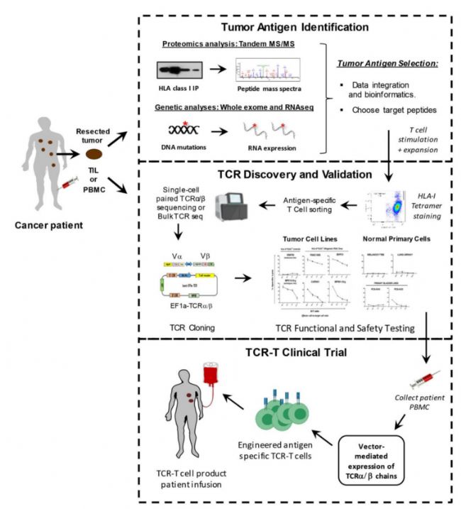 使用HLA-I多聚體、單細胞TCR測序或抗原陰性的人源化小鼠,腫瘤反應性T細胞和TCR可從自體、異體或異種細胞庫中識別鑒定。
